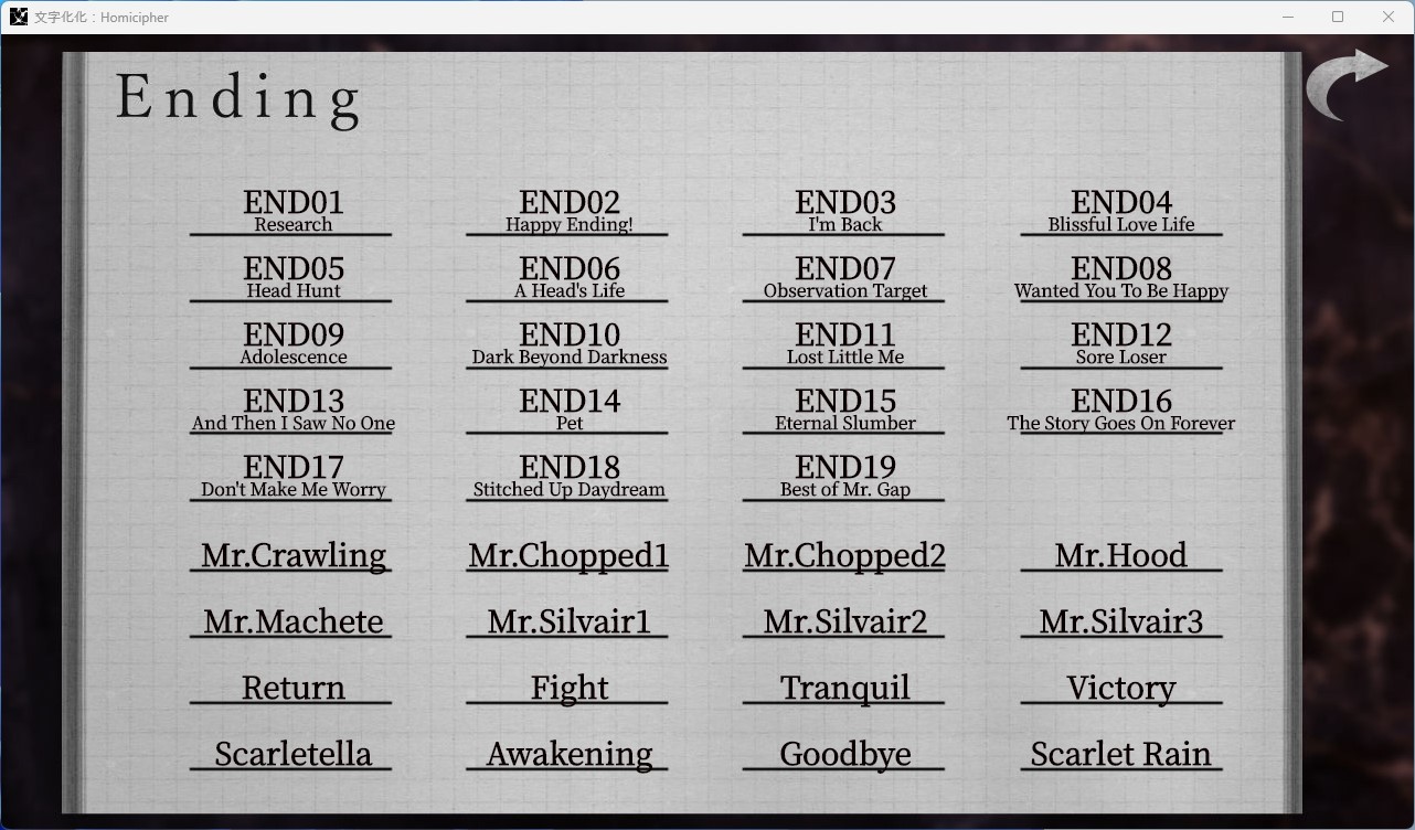 챕터 4장 18번째 장면에서 Was small를 선택하고 Mr. Hood 루트 진행. 이후 2번째 ◆, 19번째 장면에서 Mr. Hugeface를 만나 붙잡혔을 때 타이머가 전부 지나가게 냅두기.